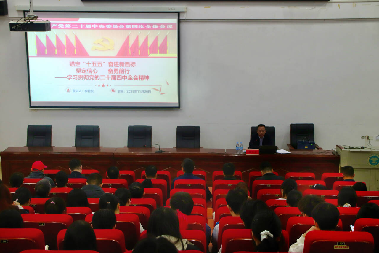 会上,李月发围绕党的二十届四中全会的内涵、习近平总书记为何如此重视 “十五五” 规划编制、“十四五” 时期成就以及贯彻落实党的二十届四中全会精神的实践路径,向全体与会人员进行深入阐释。他指出,要深入学习贯彻党的二十届四中全会精神,切实把思想和行动统一到党中央的决策部署上来。全体教职工要深刻把握全会精神的丰富内涵,充分认识坚持党的全面领导对中国式现代化的根本保障作用,准确理解“十五五”规划建议对未来发展的战略引领意义。